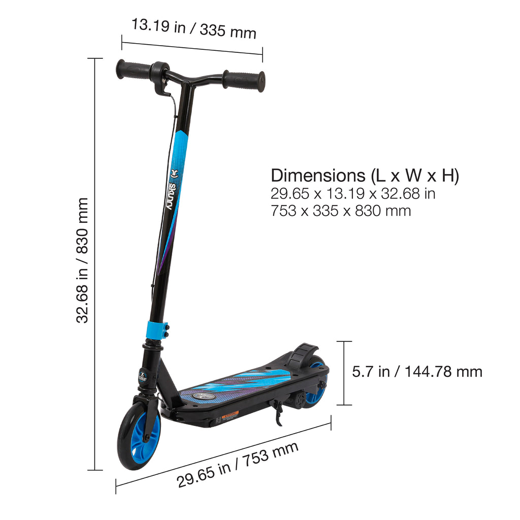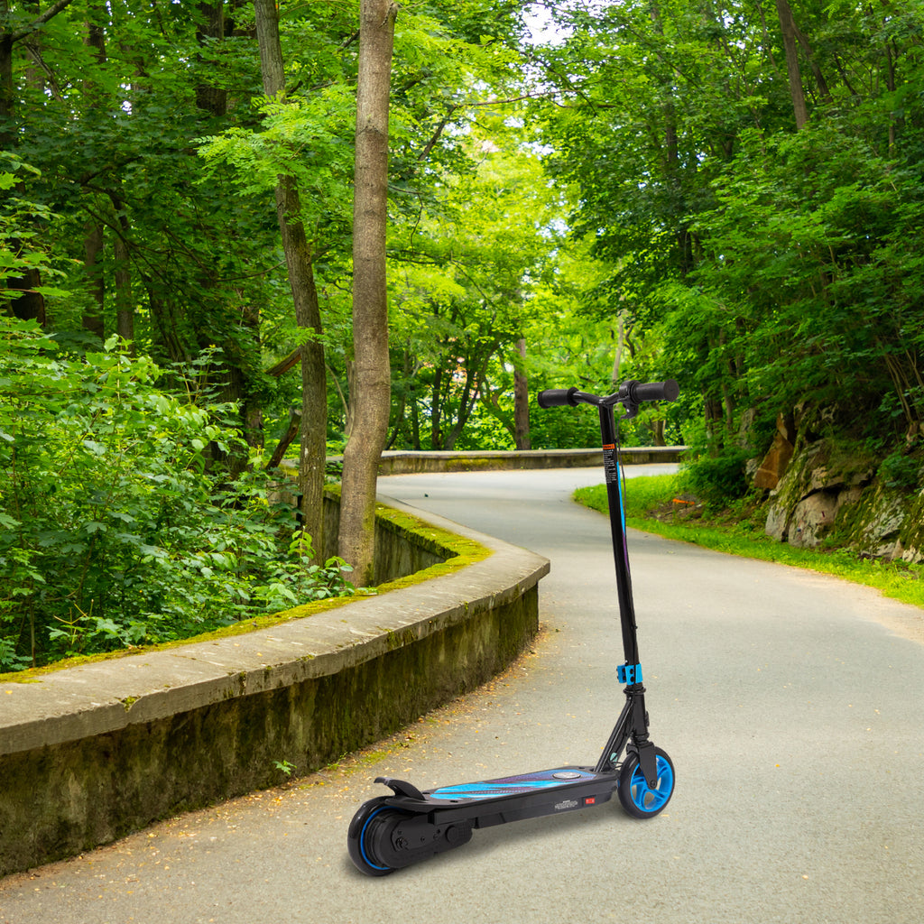 Built with a durable steel frame, this two-wheel electric scooter is ideal for kids ages 6–12. Rider-friendly features like a thumb-activated throttle, easy-grip handlebars, and rear foot brake provide smooth control, while the high-torque motor and 5.12 in (130 mm) high-impact urethane wheels ensure a stable, enjoyable ride.